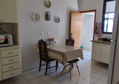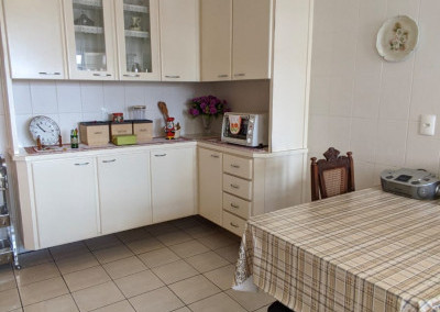 - Cozinha bem iluminada, equipada com armários e utensílios em bom estado
